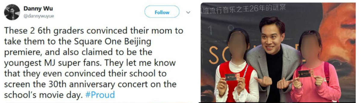 These 2 6th graders convinced their mom to take them to the Square One Beijing premiere, and also claimed to be the youngest MJ super fans. They let me know that they even convinced their school to screen the 30th anniversary concert on the school's movie day. #Proud