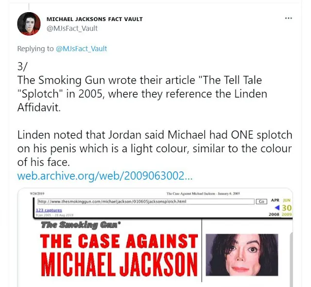 MJs Fact Vault likes to focus on the dark blemish located on the right underside of Jackson's penis. However, Thomas Sneddon is clear that Jordan described discoloration on his "lower torso, buttocks, and genitals, including a particular blemish on his penis."