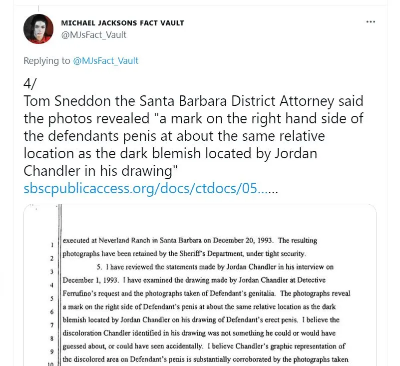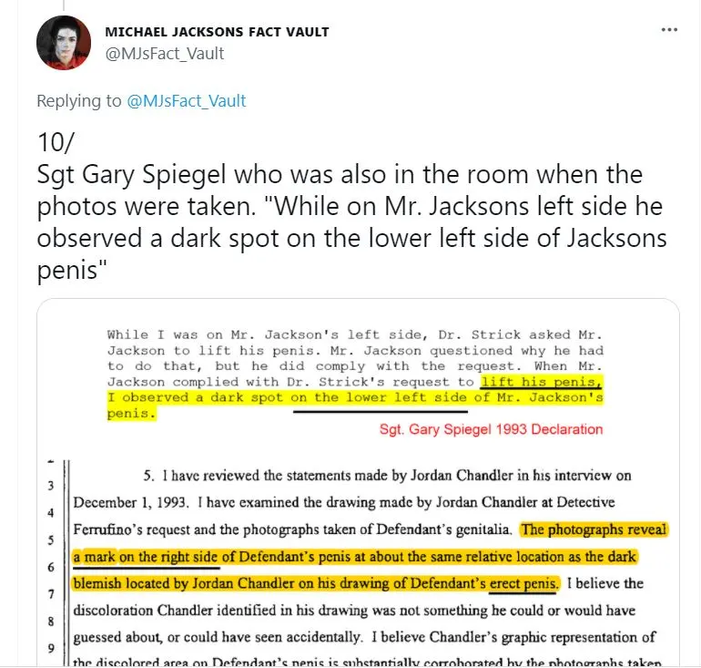 What is unequivocal is that MJs Fact Vault has undermined their own credibility by sharing this final quote. Throughout their Twitter feed, they have consistently asserted that the dark blemish was consistently located on the right central side, not the underside. However, with quotes such as “Dr. Strick asked Mr. Jackson to lift his penis” and “I observed a dark spot on the lower left side of Mr. Jackson’s penis,” along with emphasizing that Thomas Sneddon stated that Jordan’s drawing was of Jackson’s “erect” penis, it's apparent that MJs Fact Vault has contradicted themselves.