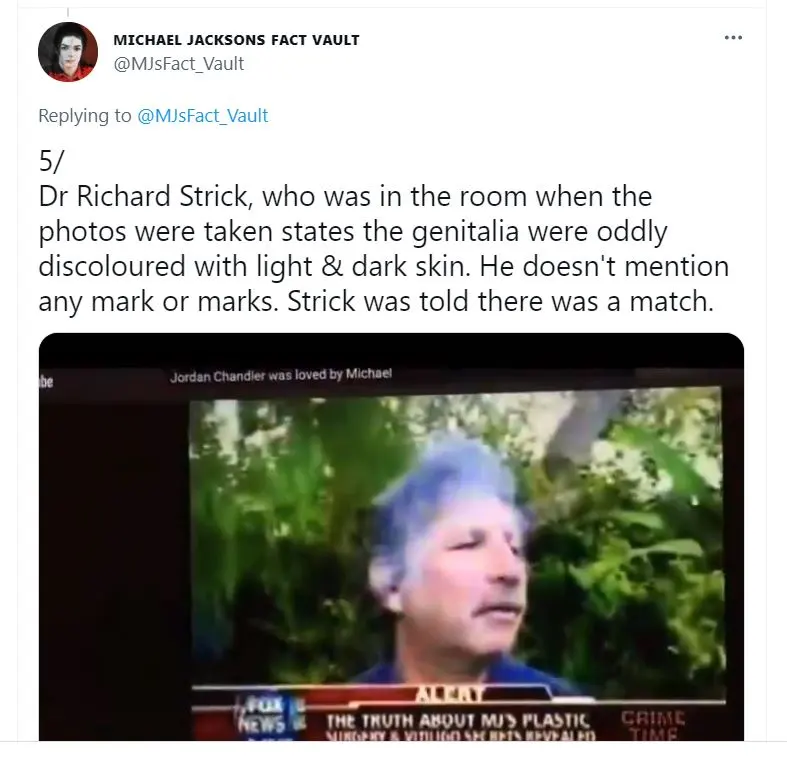 One Michael Jackson stan, who identifies themselves as Michael Jacksons Fact Vault (@MJsFact_Vault) on Twitter, staunchly believes that Jordan Chandler’s description did not align with the photos that were taken. This individual has compiled numerous examples of fellow law enforcement officers (and a few tabloid sources) contradicting Thomas Sneddon’s 2005 declaration.