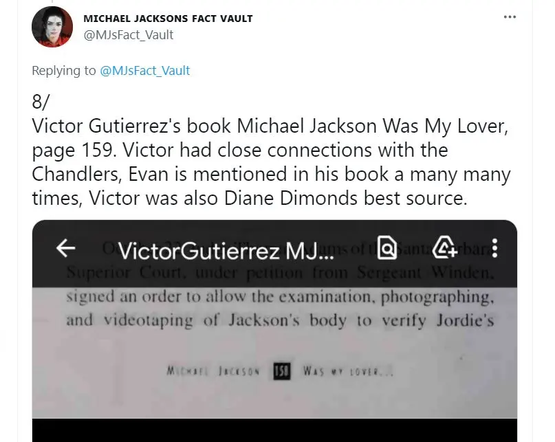 Once again, this is very similar to the previous post concerning Diane Diamond. It's immaterial what was asserted in Victor Gutierrez's book, and Evan Chandler, Jordan's father, was not a covert collaborator, regardless of the proclamations by supporters of Jackson. Victor Gutierrez never had access to Jordan's account or the series of photographs that were taken.