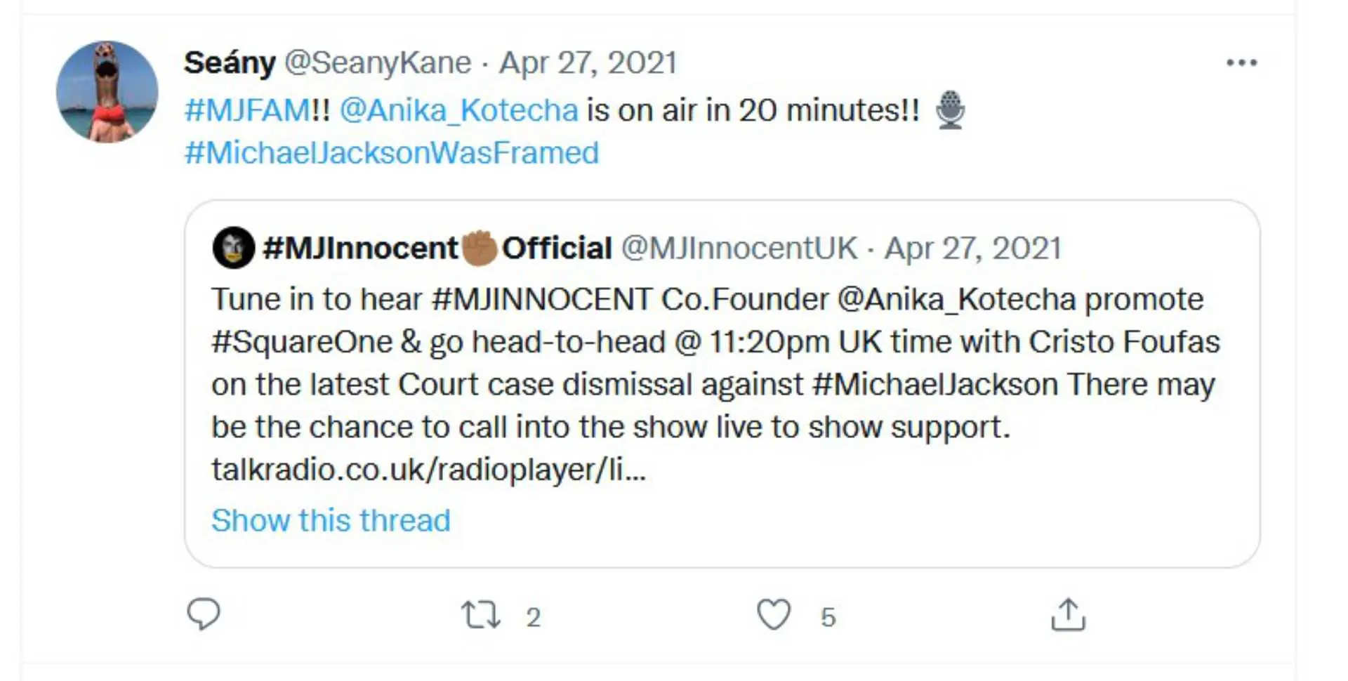 The talk show commenced with a video call from Anika Kotecha, the co-founder of the misinformation website mjinnocent.com, who echoed the familiar "it was always about money" as well as recommended the fan-made documentary Square One to the host. Overall, the interview was civilised, if far from factual. However, the other co-founder Seány O’Kane, a long-term Jackson fanatic from Northern Ireland was conspicuously absent from the interview, though he did promote her upcoming appearance on the show via Twitter.