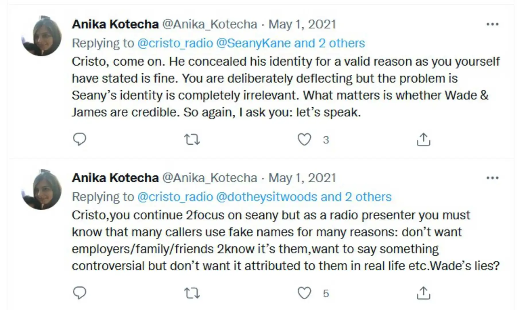 Cristo, come on. He concealed his identity for a valid reason, as you yourself have stated is fine. You are deliberately deflecting, but the problem is Seany’s identity is completely irrelevant. What matters is whether Wade and James are credible. So again, I ask you: let’s speak.
