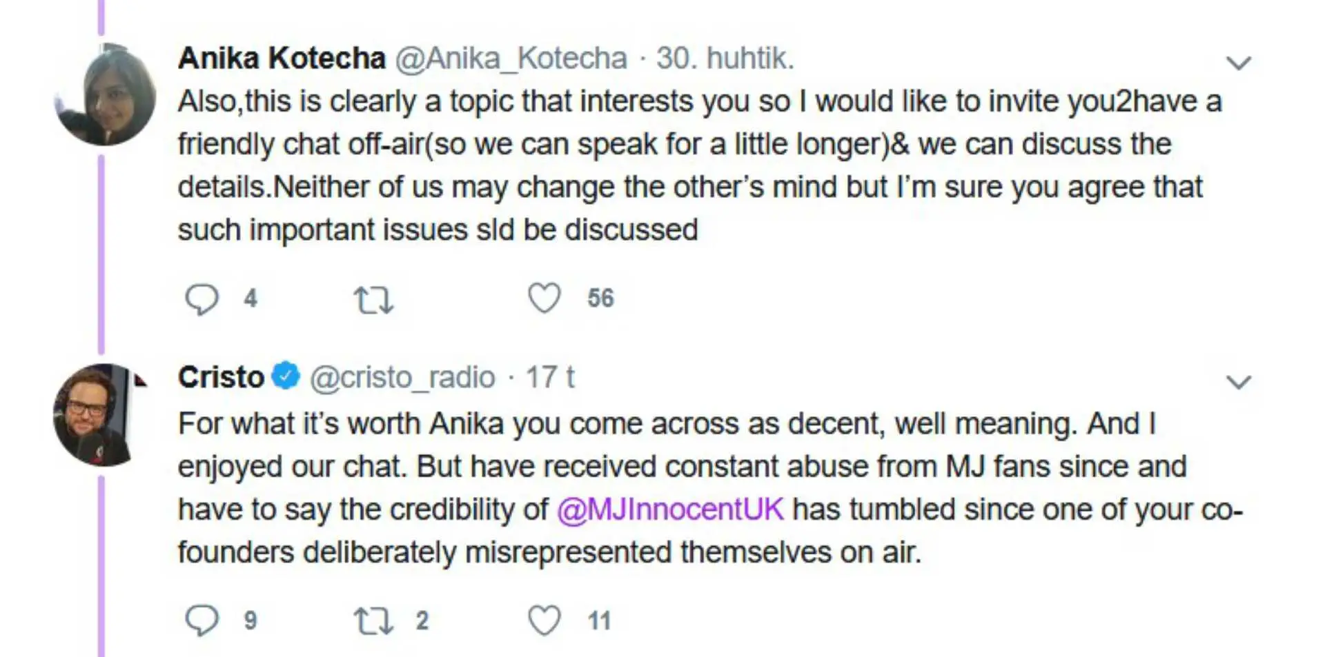 For what it’s worth, Anika, you come across as decent and well-meaning. I enjoyed our chat. However, I have received constant abuse from MJ fans since, and I have to say the credibility of @MJInnocentUK has tumbled after one of your co-founders deliberately misrepresented themselves on air.