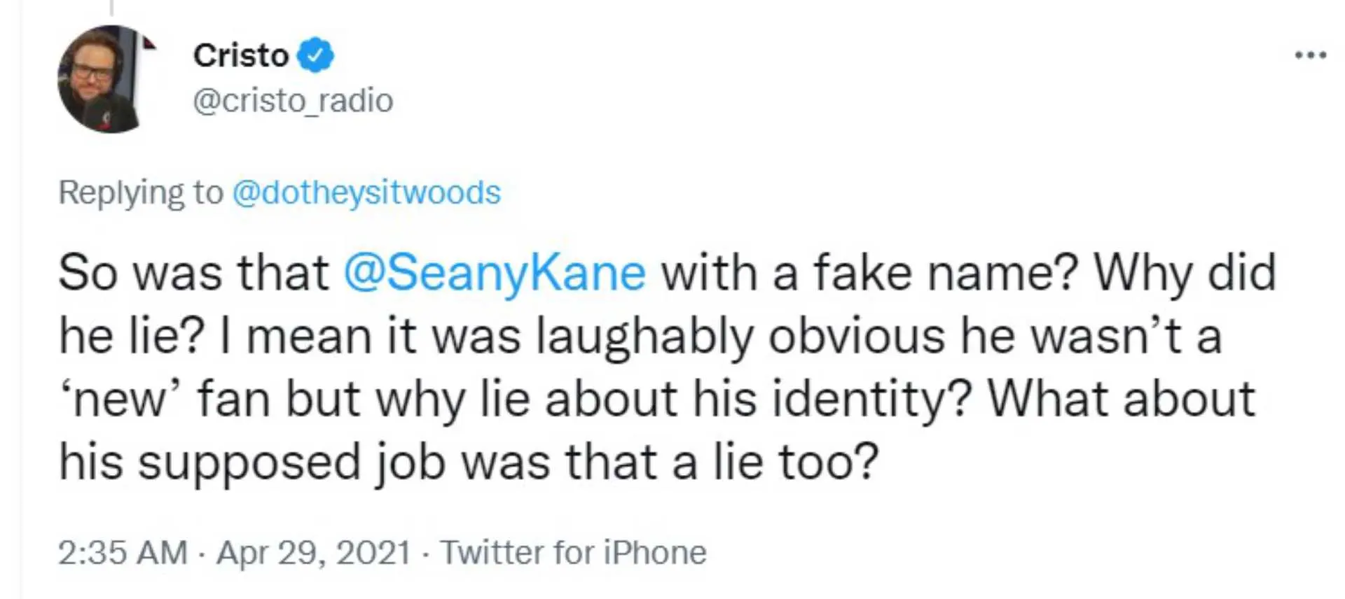So, was that @SeanyKane with a fake name? Why did he lie? I mean, it was laughably obvious he wasn’t a ‘new’ fan, but why lie about his identity? And what about his supposed job — was that a lie too?