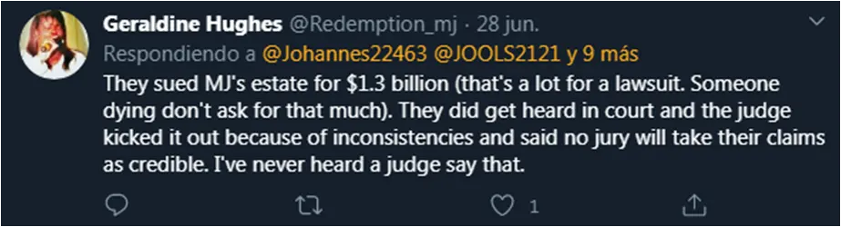 They sued MJ's estate for $1.3 billion (that's a lot for a lawsuit. Someone dying don't ask for that much). They did get heard in court and the judge kicked it out because of inconsistencies and said no jury will take their claims as credible. I've never heard a judge say that.