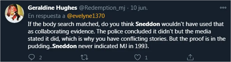 If the body search matched, do you think Sneddon wouldn't have used that as collaborating evidence. The police concluded it didn't but the media stated it did, which is why you have conflicting stories. But the proof is in the pudding..Sneddon never indicated MJ in 1993.