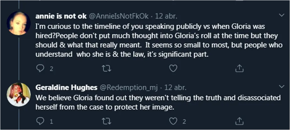 I'm curious to the timeline of you speaking publicly vs when Gloria was hired? People don't put much thought into Gloria's roll at the time but they should & what that really meant. It seems so small to most, but people who understand who she is & the law, it's significant part.