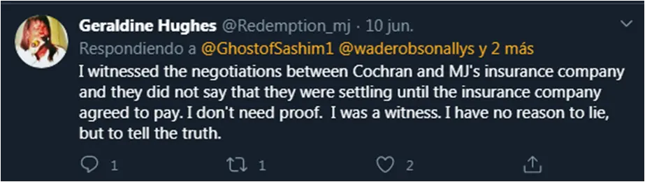 I witnessed the negotiations between Cochran and MJ's insurance company and they did not say that they were settling until the insurance company agreed to pay. I don't need proof. I was a witness. I have no reason to lie, but to tell the truth.