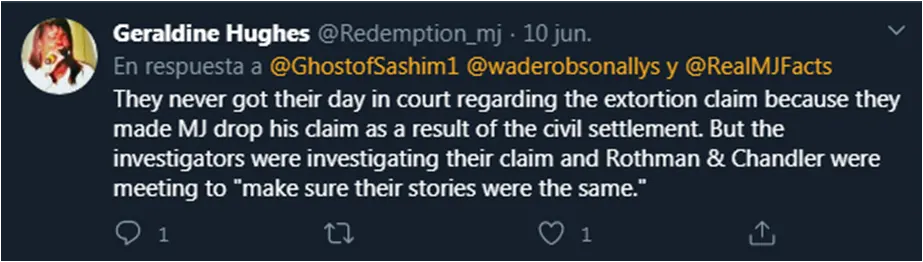 They never got their day in court regarding the extortion claim because they made MJ drop his claim as a result of the civil settlement. But the investigators were investigating their claim and Rothman & Chandler were meeting to "make sure their stories were the same.